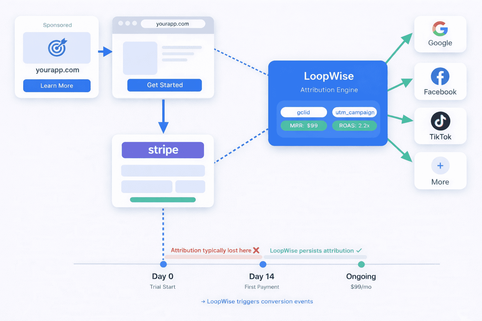 Server-side conversion tracking that captures gclid, fbclid, and UTM parameters at signup, links them to your Stripe customer, and fires conversion events via Google Ads API and Meta CAPI when payments occur. No code required.